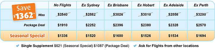 *Starting holiday costs per person, two share, for low seasons (A$). Seasonal surcharges apply outside of low season. As prices vary based on travel dates, be flexible with dates to get the for the best deals! Itinerary and vehicle types subject to change without notice. Subject to limited availability at these prices, after which higher prices apply, book now. Some governments and service operators have Covid vaccination requirements. Your included flights advised via email with 24 hours to select alternative flights, routing or airline (alternatives may be at a higher price). Included flights may not be the most direct routing. Arrive earlier/stay longer for specified airports only. Stop-overs are not possible. Subject to Booking Conditions, see Important Information before booking. © HolidayMax™ Booking Code: mp48