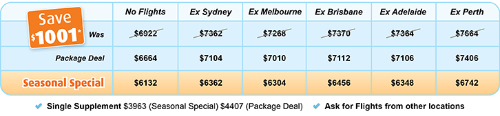 *Starting holiday costs per person, two share, for low seasons (A$). Seasonal surcharges apply outside of low season. As prices vary based on travel dates, be flexible with dates to get the for the best deals! Itinerary and vehicle types subject to change without notice. Subject to limited availability at these prices, after which higher prices apply, book now. Some governments and service operators have Covid vaccination requirements. Your included flights advised via email with 24 hours to select alternative flights, routing or airline (alternatives may be at a higher price). Included flights may not be the most direct routing. Arrive earlier/stay longer for specified airports only. Stop-overs are not possible. Subject to Booking Conditions, see Important Information before booking. © HolidayMax™ Booking Code: mp294