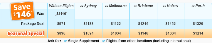 *Starting holiday costs per person, two share, for low seasons (A$). Seasonal surcharges apply outside of low season. As prices vary based on travel dates, be flexible with dates to get the for the best deals! Itinerary and vehicle types subject to change without notice. Subject to limited availability at these prices, after which higher prices apply, book now. See Important Information before booking. © DISCOVER AUSTRALIA Booking Code: mp49