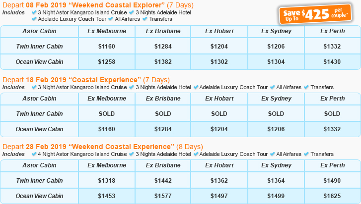 The Astor Kangaroo Island Cruise with Adelaide Stay is very popular. Many dates book out well in advance, please book soon.