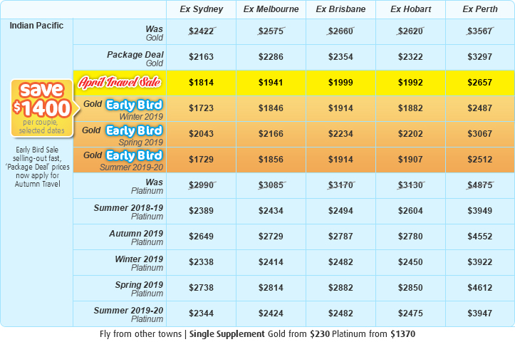 The Indian Pacific to Adelaide All-Inclusive is very popular. Many dates book out well in advance, please book soon.
