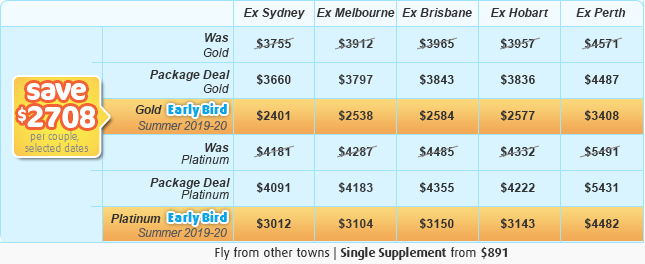 *Starting holiday costs per person, two share, for low seasons (A$). Seasonal surcharges apply outside of low season. Early Bird Specials require travel outside of the next 6 months (i.e travel in more than 6 months time). As prices vary based on travel dates, be flexible with dates to get the best deals! Itinerary and vehicle types subject to change without notice. Subject to limited availability at these prices, after which higher prices apply, book now. Ex Adelaide / Sydney prices include only flights back to Adelaide / Sydney. See Important Information before booking. © DISCOVER AUSTRALIA Booking Code: mp384