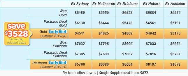 *Starting holiday costs per person, two share, for low seasons (A$). Seasonal surcharges apply outside of low season. Early Bird Specials require travel outside of the next 6 months (i.e travel in more than 6 months time). As prices vary based on travel dates, be flexible with dates to get the best deals! Itinerary and vehicle types subject to change without notice. Subject to limited availability at these prices, after which higher prices apply, book now. Ex Adelaide / Sydney prices include only flights back to Adelaide / Sydney. See Important Information before booking. © DISCOVER AUSTRALIA Booking Code: mp389