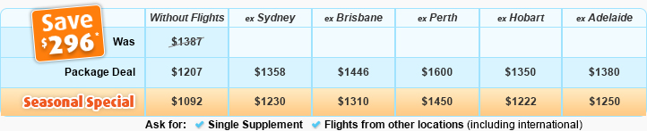 *Starting holiday costs per person, two share, for low seasons (A$). Seasonal surcharges apply outside of low season. As prices vary based on travel dates, be flexible with dates to get the for the best deals! Itinerary and vehicle types subject to change without notice. Subject to limited availability at these prices, after which higher prices apply, book now. See Important Information before booking. © DISCOVER AUSTRALIA Booking Code: mp48